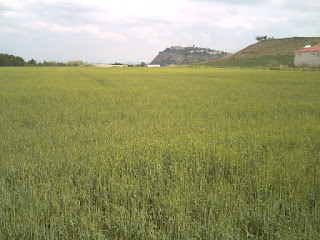 A la derecha foto de un campo de cereal en la zona de los manteles. Al fondo se puede observar lerín