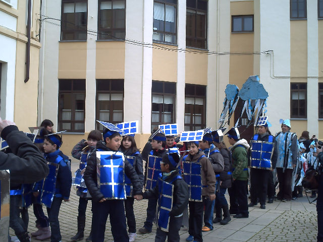 Los alumnos de infantil desfilaron con su disfraz de SOL,a continuación desfilaban los alumnos del Primer ciclo de Primaria disfrazados de VIENTO, los alumnos del Segundo Ciclo de Primaria lo hicieron con su disfraz de PLACAS SOLARES, , y por último cerraban el desfile los alumnos del Tercer Ciclo de Primaria vestidos de MOLINOS productores de electricidad. Los escolares iban acompañados de sus respectivos profesores que habían diseñado los disfraces correspondientes a cada curso y habían ayudado a la confección de los trajes de carnaval.