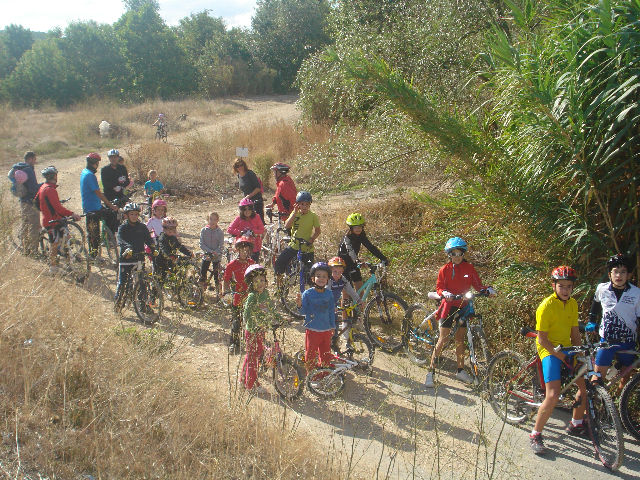 En la foto se observa a los más pequeños sentandos en el merendero del puente, descansando y reponiendo fuerzas después la marcha.