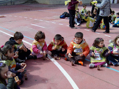 En la foto los alumnos degustando el chocolate con bizcocho.