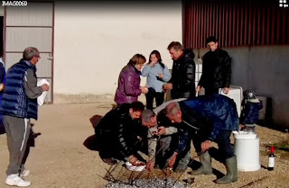 En la foto se observa a los abuelos en el momento de asar la chistorra, la salchicha y la panceta.