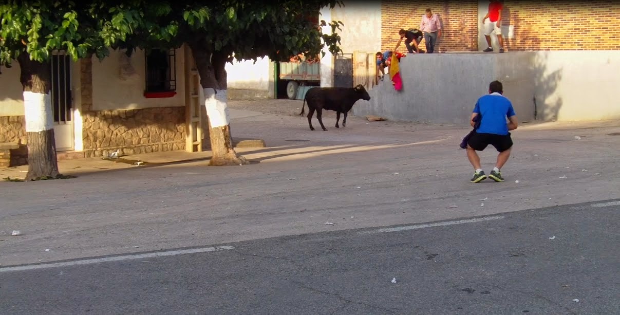 Una foto típica de las vacas en las fiestas de la Cadena. Varios mozos intentando que la vaquilla suba las escaleras.