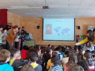 En la imagen los alumnos escuchan la explicación de la Profesora de Inlgés, Puy Yanguas, sobre la vida de Malala.