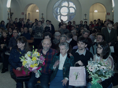 En la foto se observa la capilla llena de vecinos y familiares de Angelita después de recibir la placa del Ayuntamiento y los ramos de flores de las Asociaciones Club de Jubilados y Bella Vista.