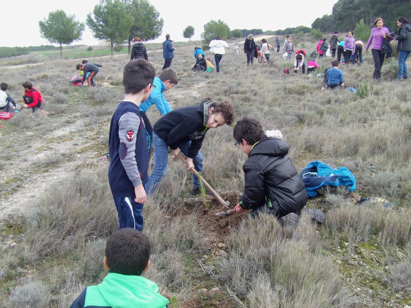 En la fotografía se observa el trabajo de los alumnos en la plantación de los árboles en una zona del Monte cerca del Polideportivo.
