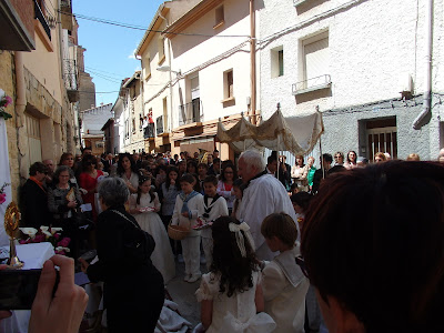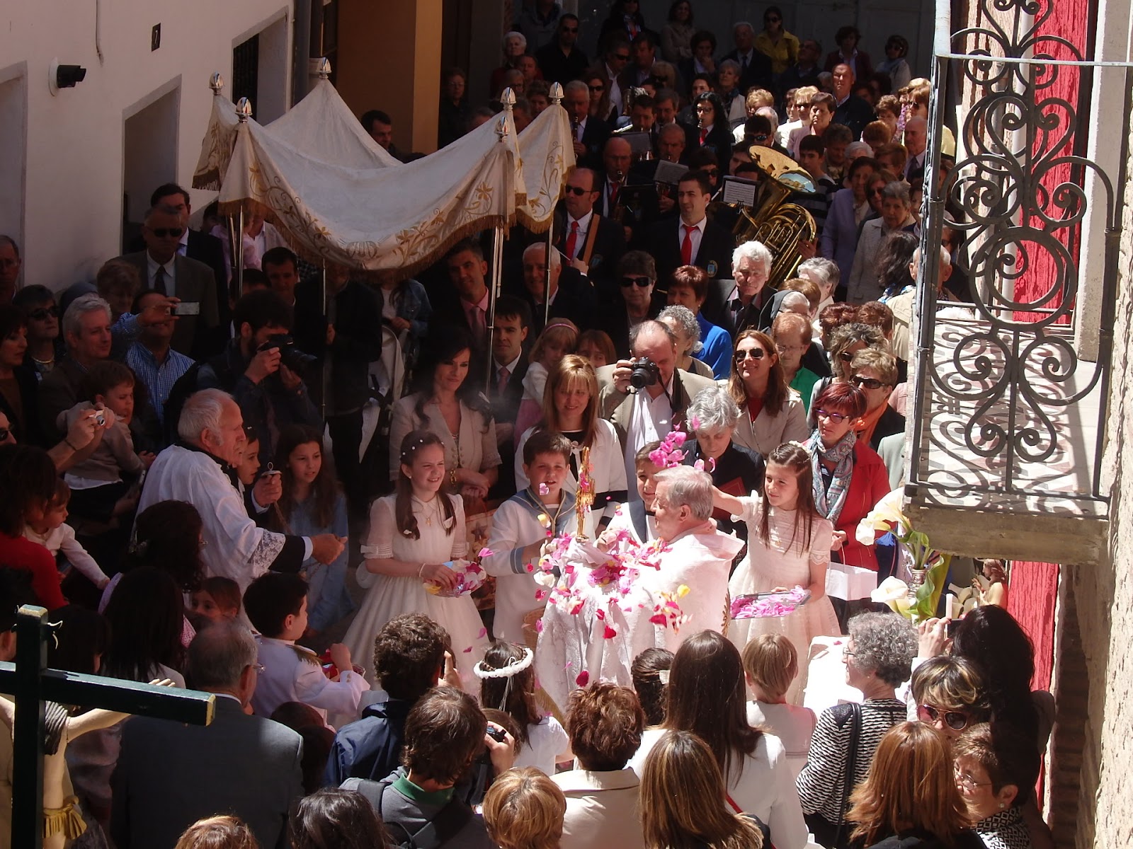 comitiva los niños y niñas de la primera comunión con cestos de pétalos de