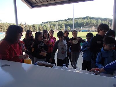 Terminado el trabajo de la plantación, los alumnos recogieron las herramientas, que habían traído y se reunieron en el campo de fútbol para merendar pastas y zumos, obsequio del Club de Fútbol Lerinés. Una vez terminada la merienda se dirigieron a la escuela para recoger el material y marchar a sus casas.
