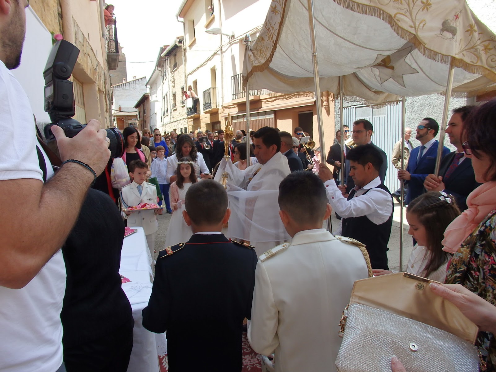 comitiva los niños y niñas de la primera comunión con cestos de pétalos de