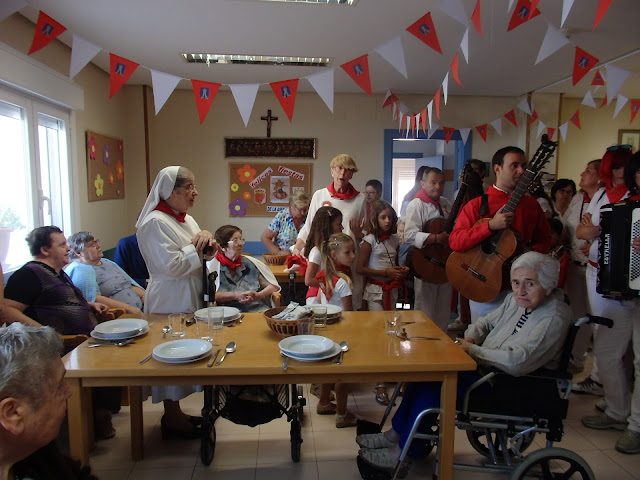 A las 11:30 la alcaldesa Consuelo Ochoa y las concejales Ana Cabezón,  Mari Feli Echeverría y José Justo, acompañadas de un grupo de niños y niñas, se acercaron a la Residencia de Ancianos para rendir un homenaje a los asilados imponiéndoles el pañuelico rojo de fiestas. Fueron las escolares quienes se encargaron de ponerles el pañuelo al cuello, ayudadas por las hermanas y las trabajadoras de la Residencia. Acudieron a la cita la escuela de jotas de Andosilla para cantarles a los ancianos varias jotas que provocaron emoción y alguna lágrima. Antonio De La Torre representando a los asilados dio las gracias a la alcaldesa por la visita tan grata.
