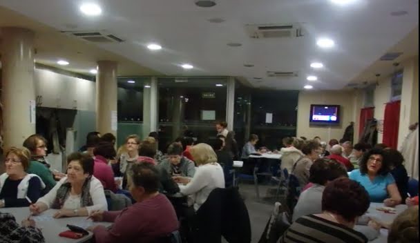 una sesión del juego de bingo con la participación de muchas jubiladas y algún