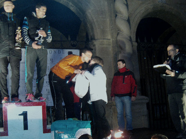 Antonio Casado el primer navarro en llegar a la meta en octavo lugar recibe el premio de un cordero de Mª Carmen Castillo de la Carnicería Rodríguez Castillo .