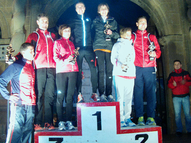 Los ganadores locales de la carrera: Juan Moreno, Miguel Rodríguez, Ricardo Suescun, María Rodríguez, Eva Moreno, Laura León acompañados por el presidente del Club atlético Lerinés José Miguel Irigoyen.